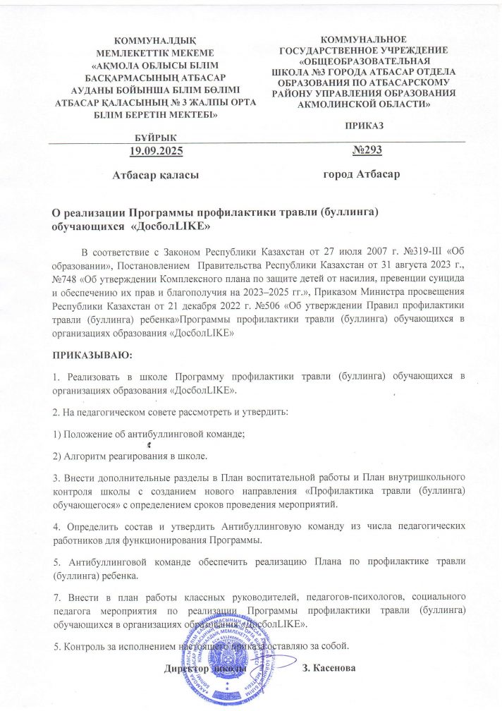 Оқушылар арасындағы бұзақылықтың алдын алу бойынша «ДосболLIKE» бағдарламасын жүзеге асыру туралы бұйрығы