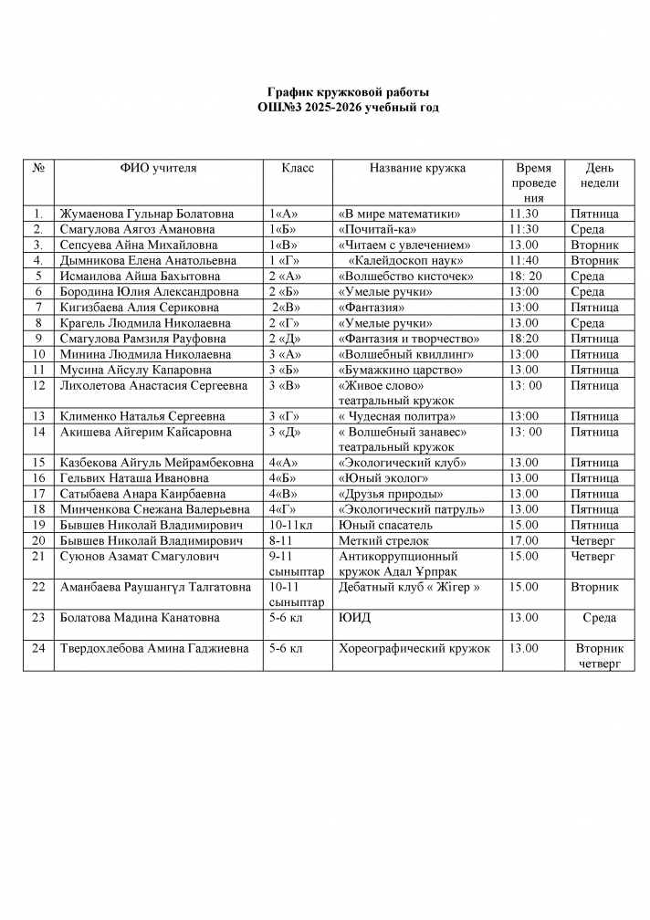 2025-2026 оқу жылына арналған ОШ№3 үйірме жұмысының жоспары