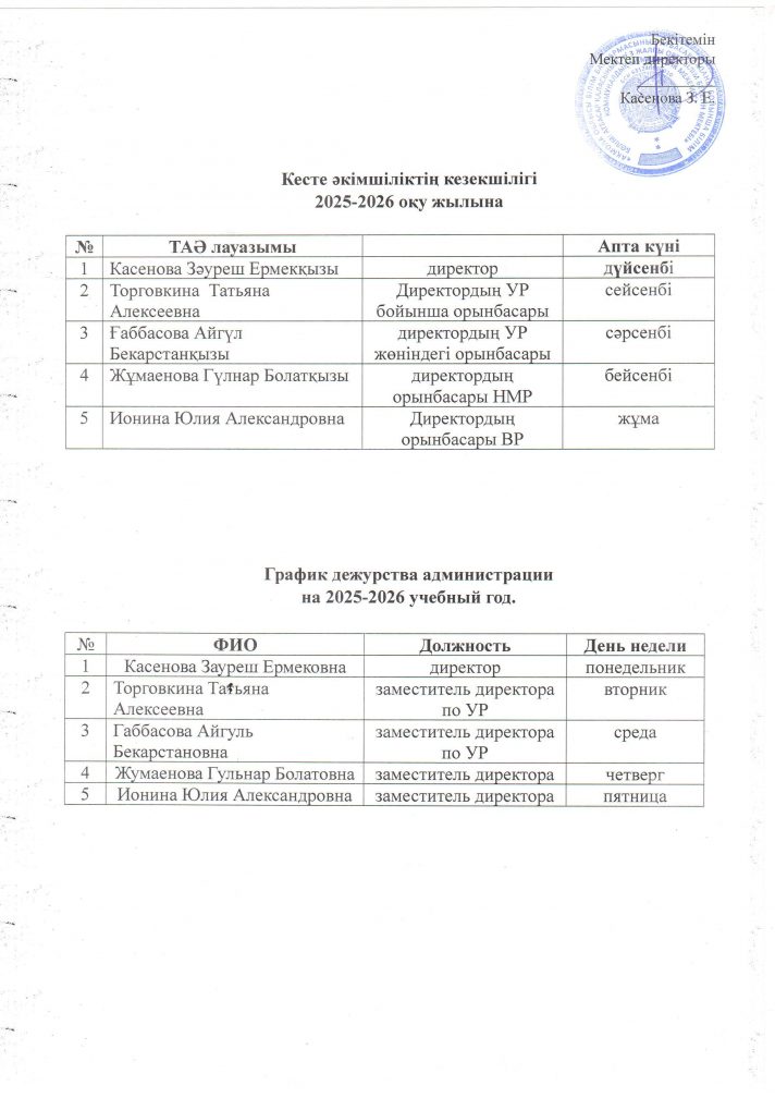 Әкімшіліктің 2025-2026 оқу жылына арналған кезекшілік кестесі