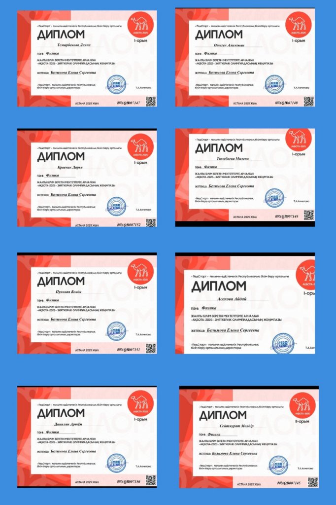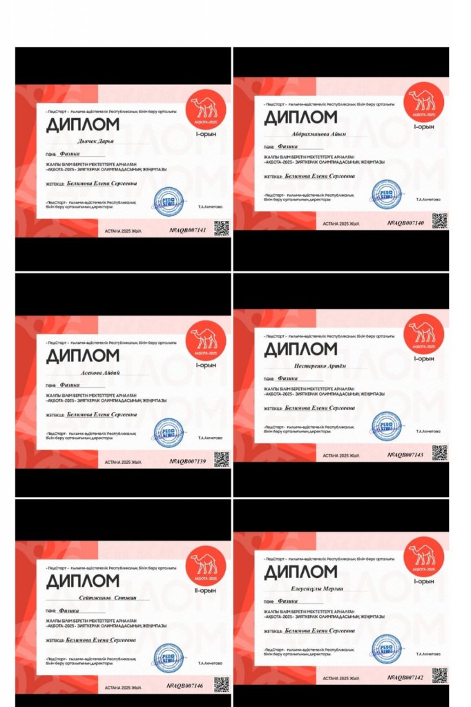 Физика пәні бойынша өткен "Ақ бота" республикалық олимпиадасына мектебіміз белсенді қатысты. Команда құрамында 15 оқушы болды және барлық оқушылар жүлделі орындарға ие болды. Оқушылар жоғары дайындық деңгейін, шығармашылық қабілеттерін, техникалық ойлауын және командалық рухын көрсетті. Қатысушыларымызбен мақтанамыз және алда тек жеңістер тілейміз!