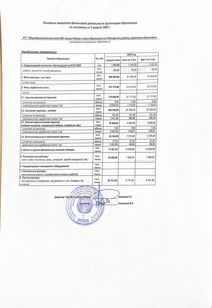 2025 жылғы 3 тоқсандағы жағдай бойынша білім беру ұйымының қаржылық қызметінің негізгі көрсеткіштері