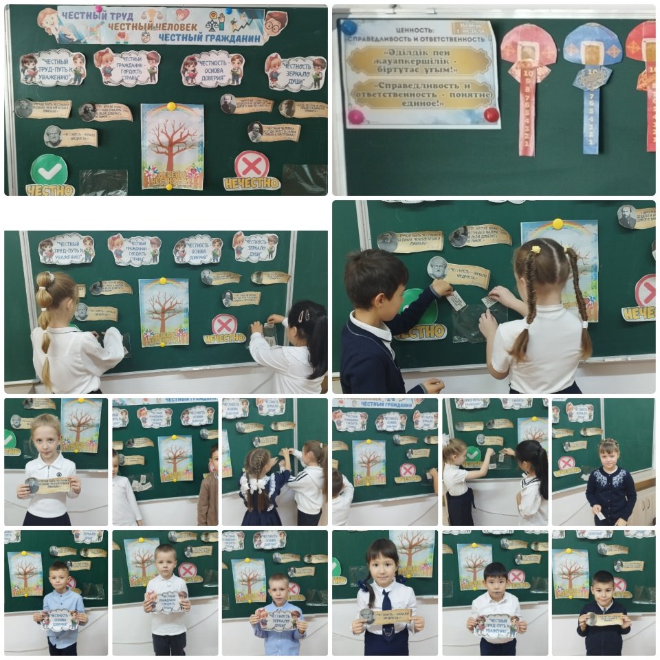 Оқушылар адалдықтың, еңбекқорлықтың және жауапкершіліктің маңыздылығы туралы ой бөлісті. Өмірден және ертегілерден мысалдар келтіріп, ата-аналарының мамандықтары туралы айтты.