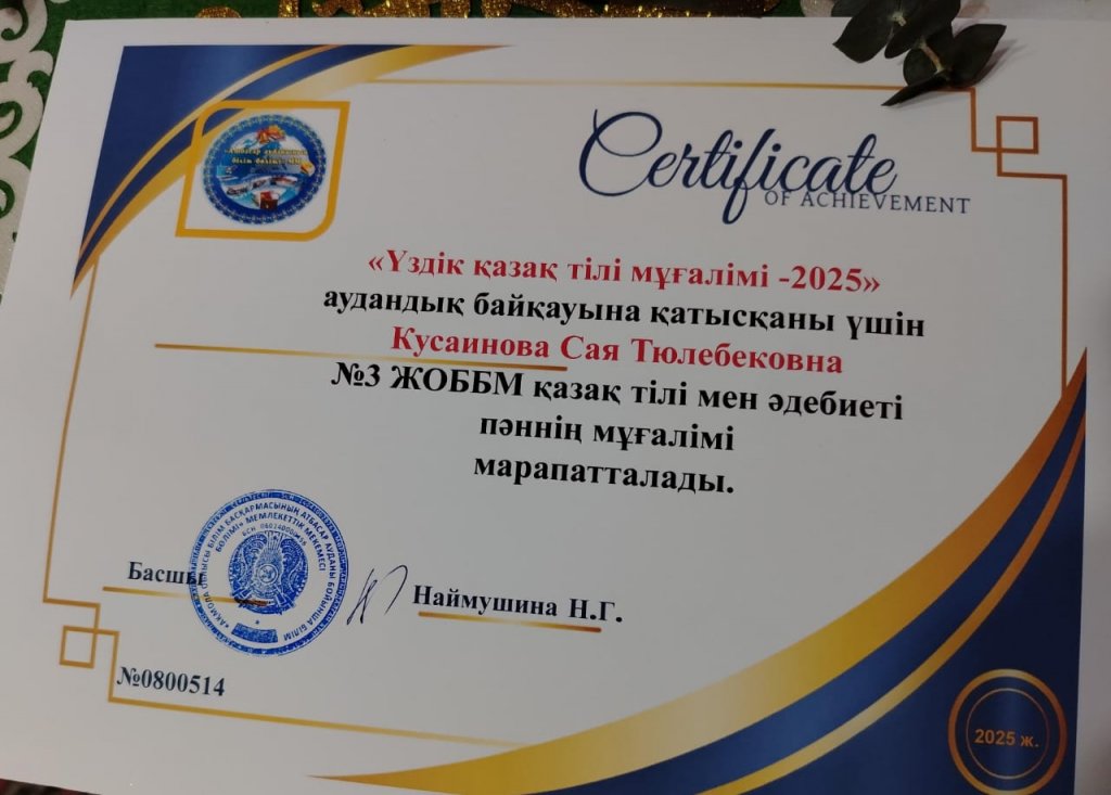 Бұл конкурсқа №3 ЖОББМ қазақ тілі мен әдебиеті пәні мұғалімі Кусаинова Сая Тюлебековна қатысты. Ол өз портфолиосы, әдістемелік жұмыс тәжірибесі және инновациялық оқу әдістері арқылы кәсіби шеберлігін көрсетіп, пәнге деген шығармашылық көзқарасын танытты. Конкурстың нәтижесі бойынша сертификатпен марапатталды.